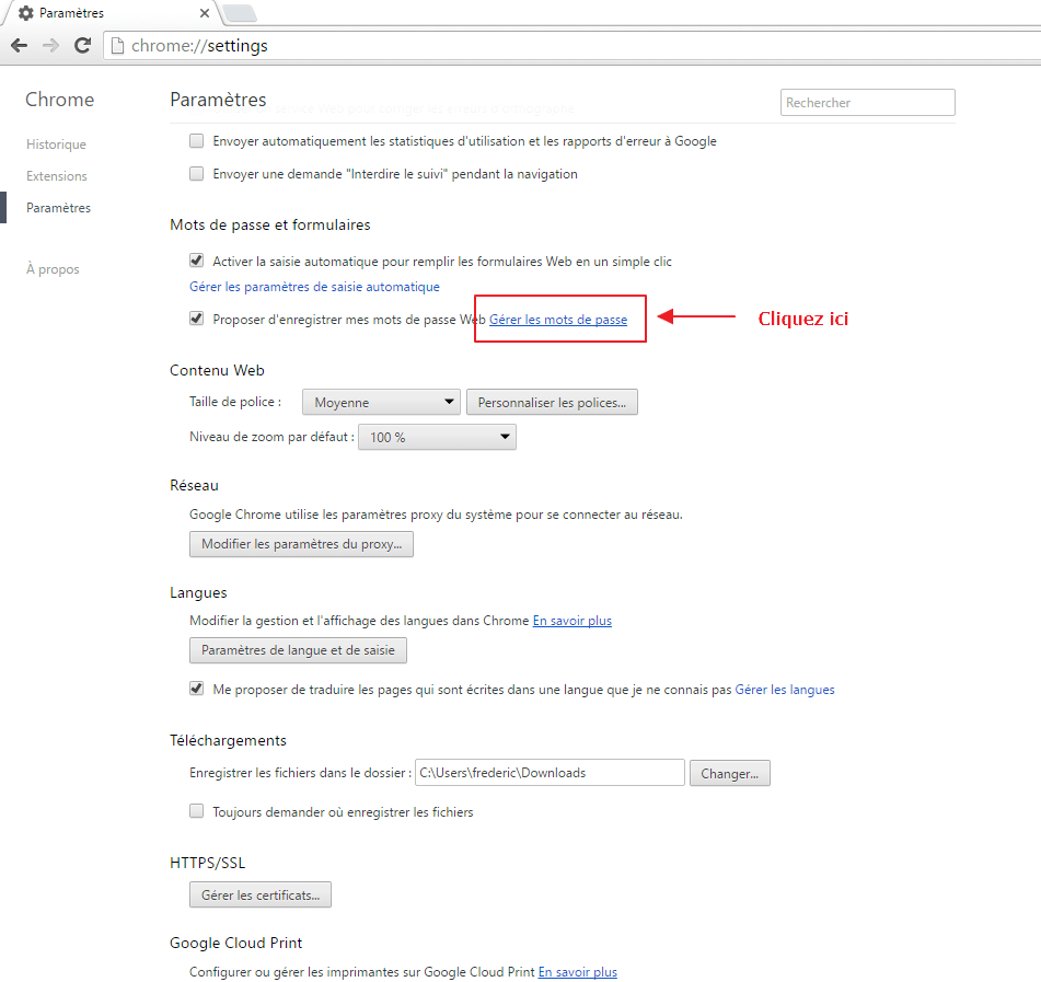 Dans la partie "Mots de passe et formulaires" sélectionnez le menu "Gérer les mots de passe."