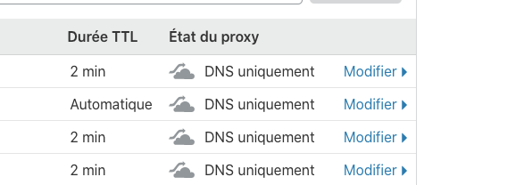 Cloudflare >> DNS >> Etat des proxy sur OFF pour les entrées A.