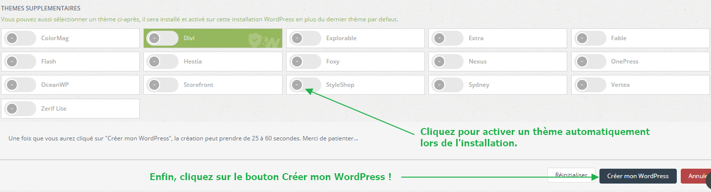 Une fois votre sélection effectuée, cliquez sur le bouton "Créer mon WordPress", patientez que la procédure d'installation soit terminée, et profitez de votre nouveau WordPress ! :)