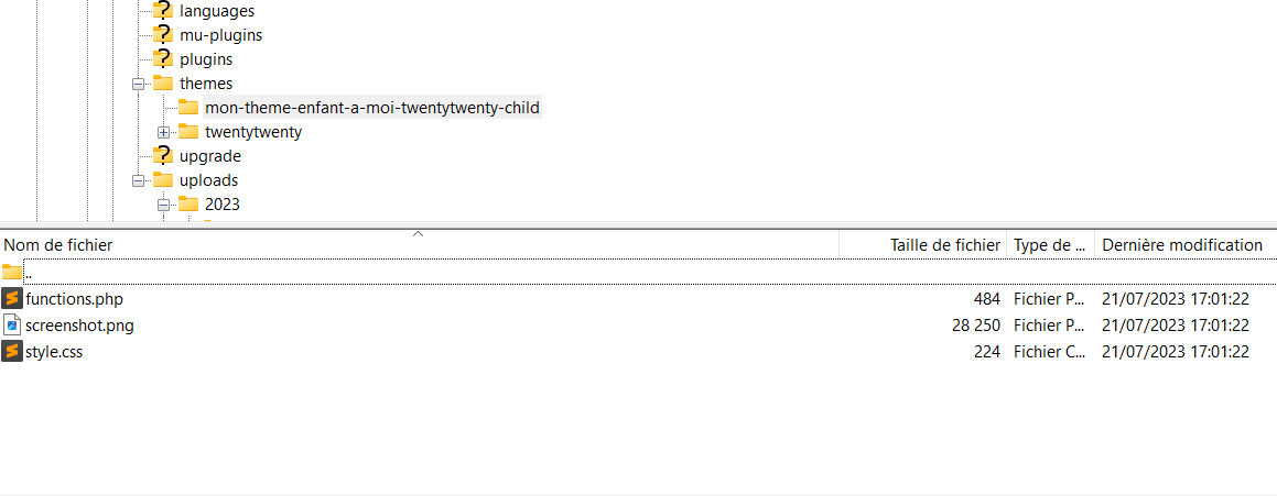 Une fois connecté, rendez-vous dans le répertoire “wp-content” puis dans le dossier “thèmes”. Nous prendrons comme exemple le thème twentytwenty. Mais cette explication est valable pour tous les thèmes exceptés ceux sur lesquels nous nous arrêterons plus tard.